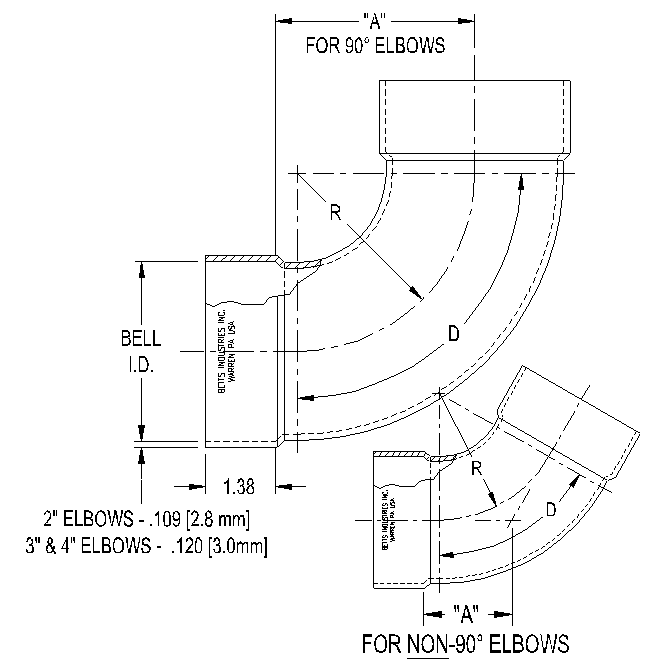 Betts seamless belled elbows are designed for use on cargo tanks and satisfy a wide variety of piping needs.  The seamless belled elbow offers multiple advantages over standard elbows.  Significant reduction in joint preparation and fit-up time can be realized while the belled end allows for a fillet weld in place of a more difficult butt weld joint.  Slight angular piping mis-alignments can be easily accommodated and since there is no longitudinal weld seam, the elbow is clean and leak free.