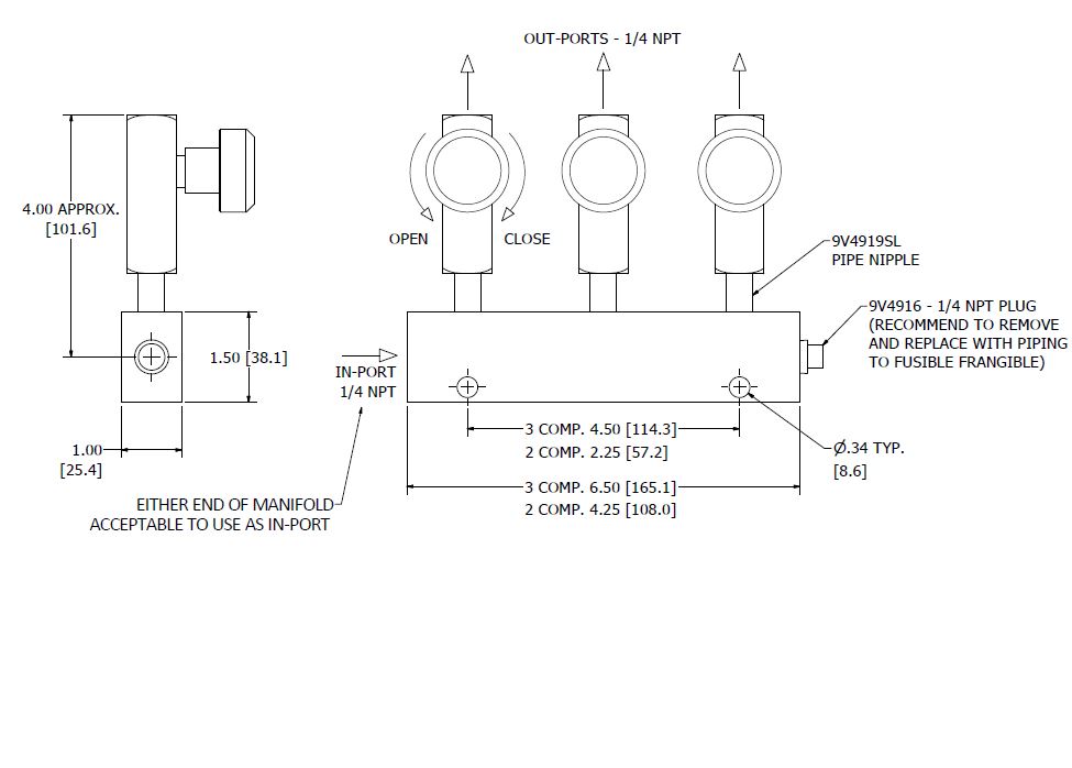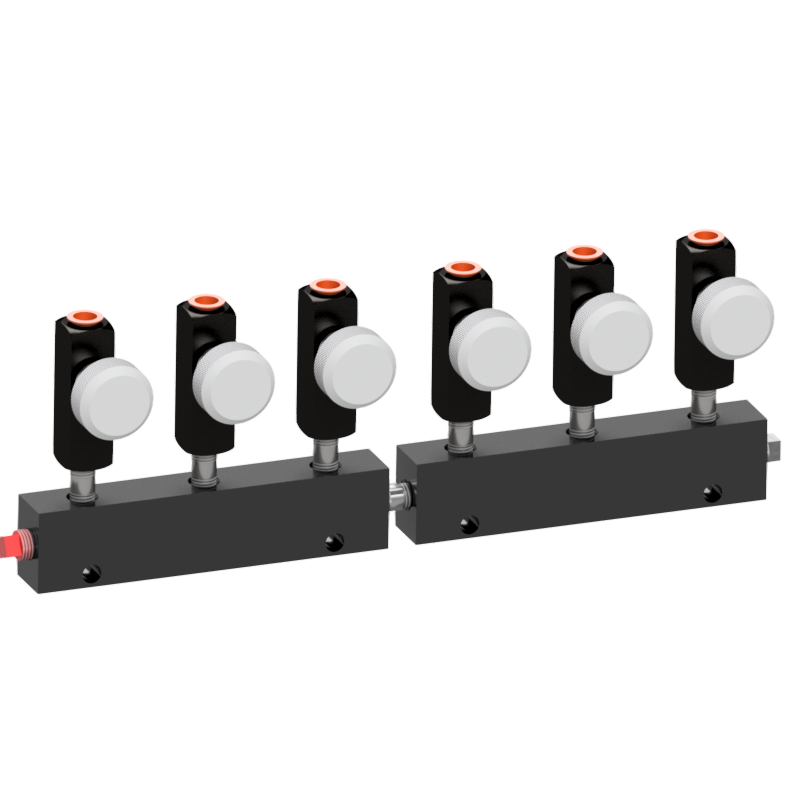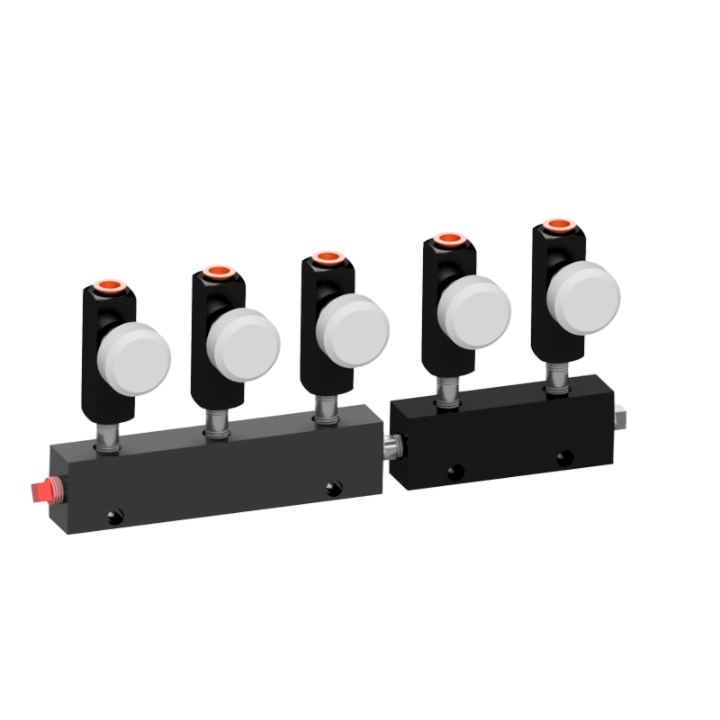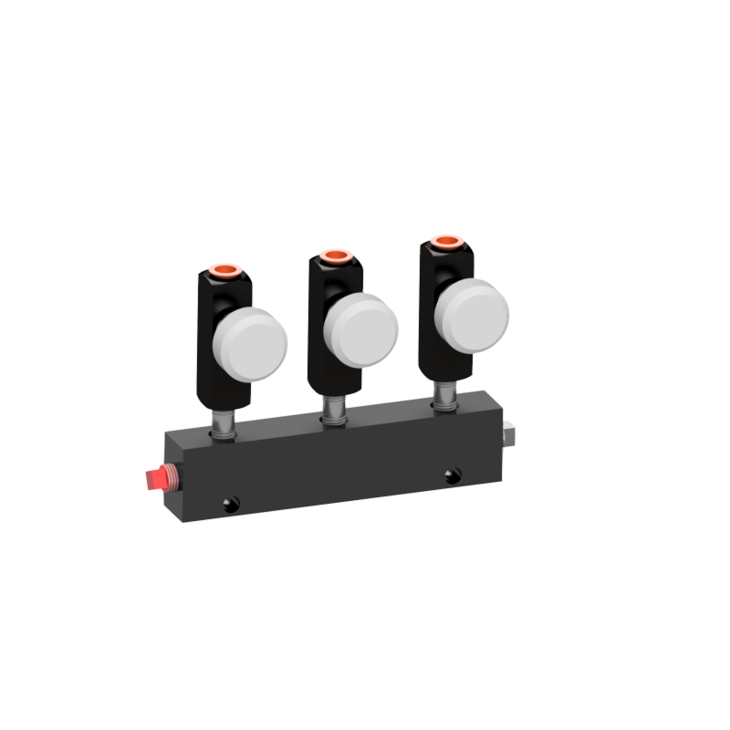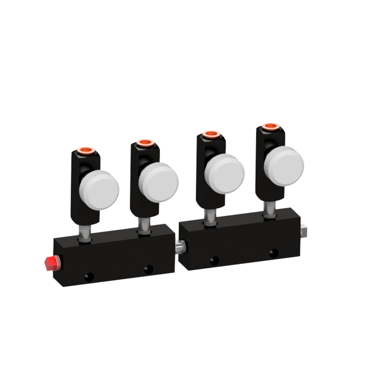 This hydraulic distributor consists of a multiple outlet manifold with individual control valves for each cargo tank compartment.  It is used to manually select which valves are actuated for a multi-compartment cargo tank.  When a control valve is closed, it blocks the flow of hydraulic fluid from the pump to the valve, yet flow can always travel from valve back to the pump.  This unique and critical feature is required to insure the proper function of the emergency shut-down system as-well-as protects the valve from over-pressurization due to possible thermal expansion.
